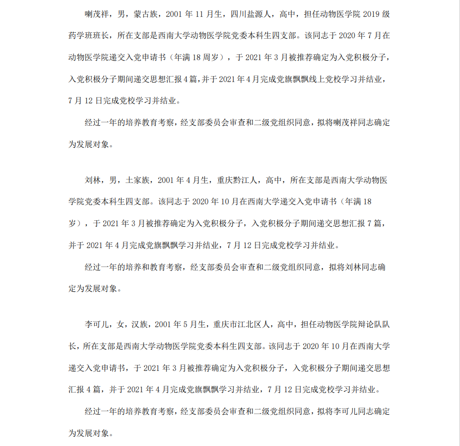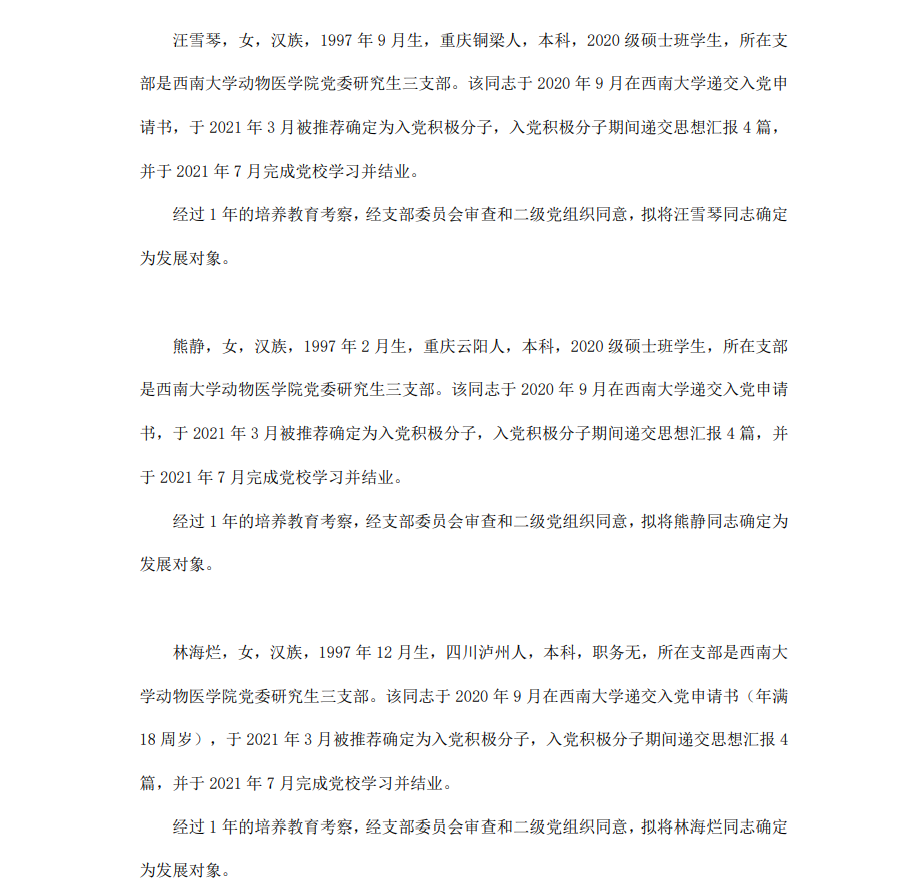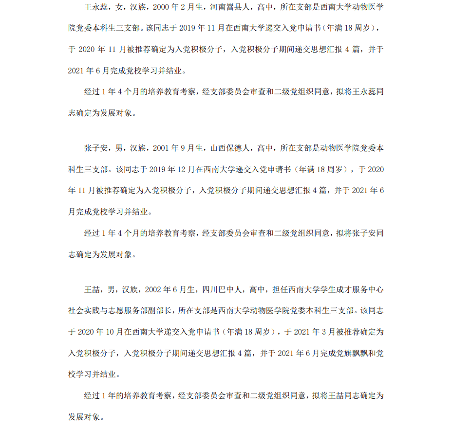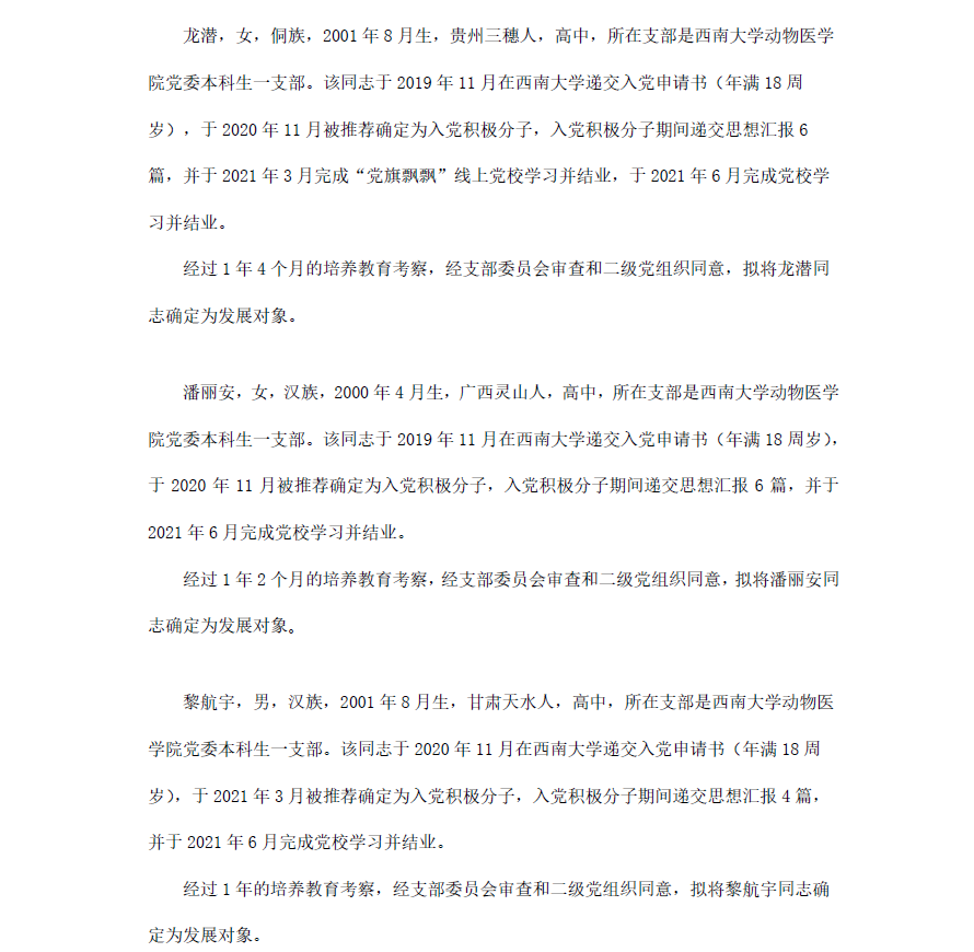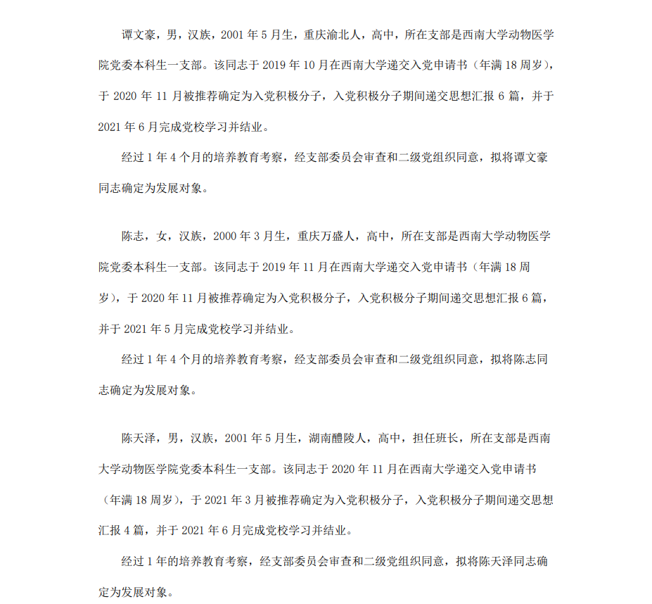 根据《中国共产党章程》、《中国共产党发展党员工作细则》和《西南大学发展党员工作实施细则》精神,经各团支部提名推荐,在征求党内外群众意见和党支部考察基础上,中共西南大学365上市公司(英国)集团委员会讨论,拟定龙潜等49名同学为近期发展对象,现将其基本情况予以公示。