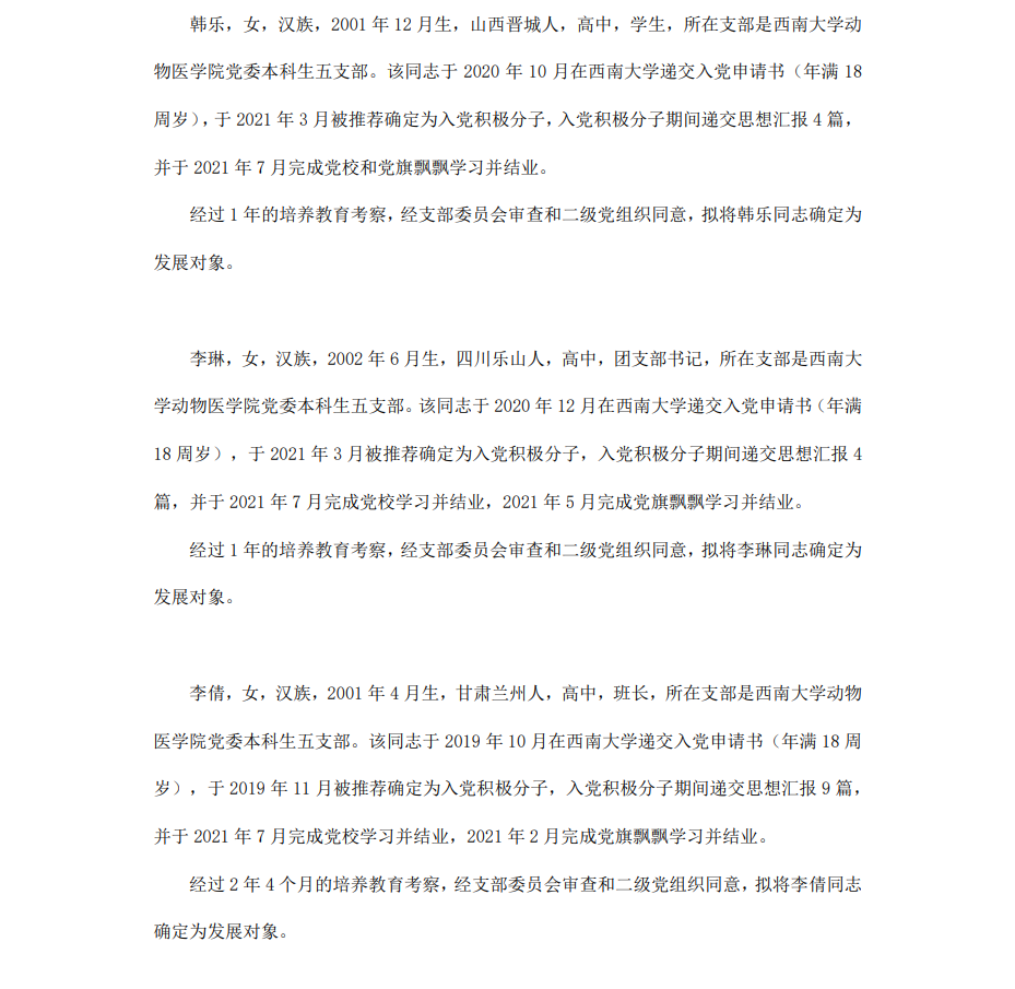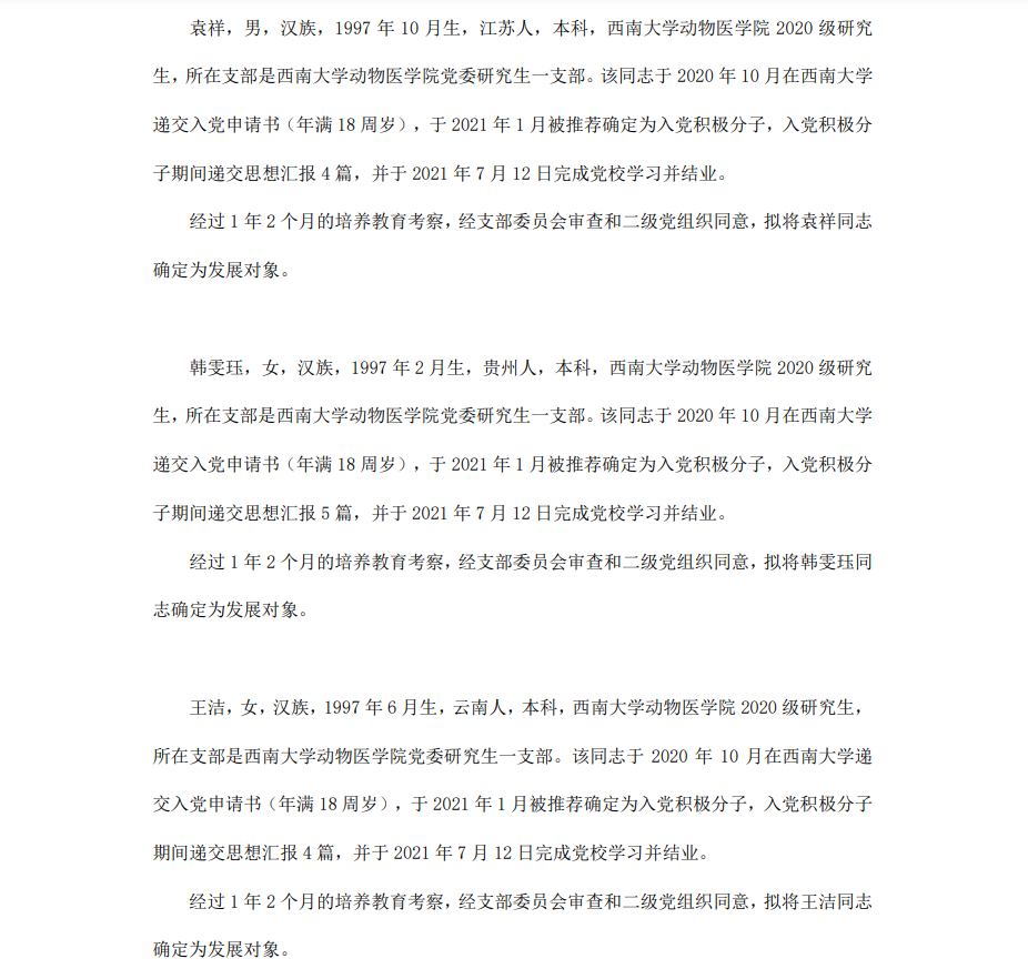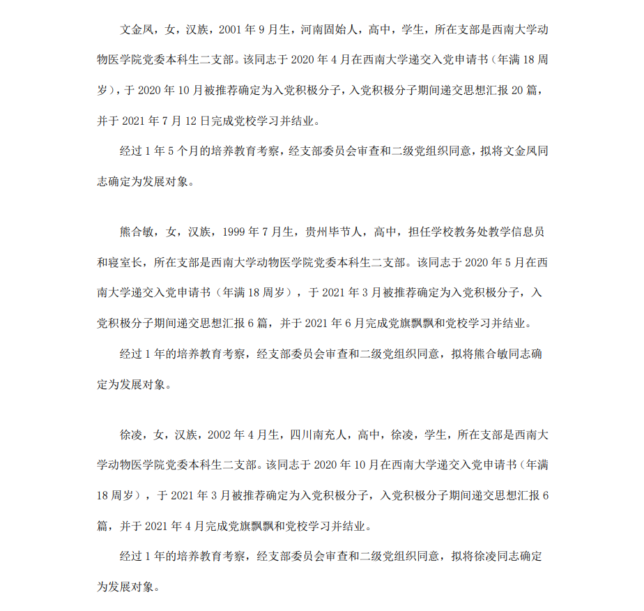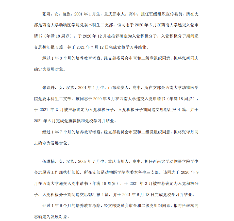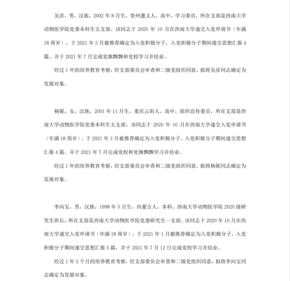 根据《中国共产党章程》、《中国共产党发展党员工作细则》和《西南大学发展党员工作实施细则》精神,经各团支部提名推荐,在征求党内外群众意见和党支部考察基础上,中共西南大学365上市公司(英国)集团委员会讨论,拟定龙潜等49名同学为近期发展对象,现将其基本情况予以公示。