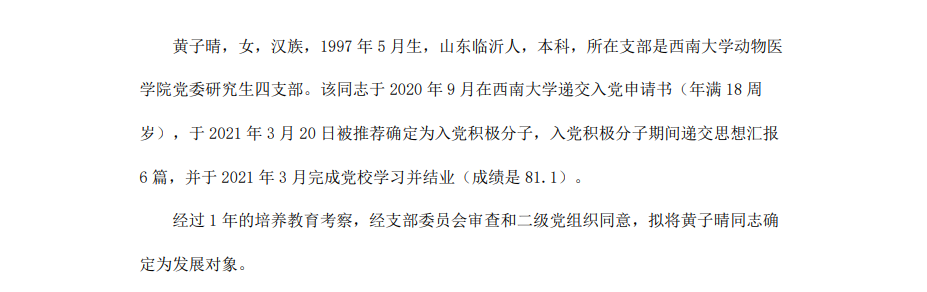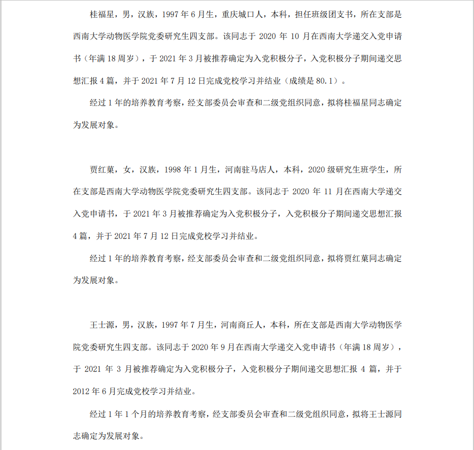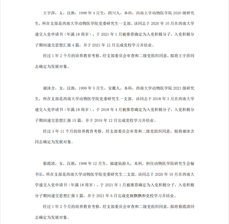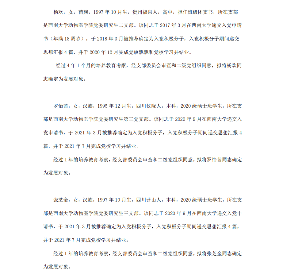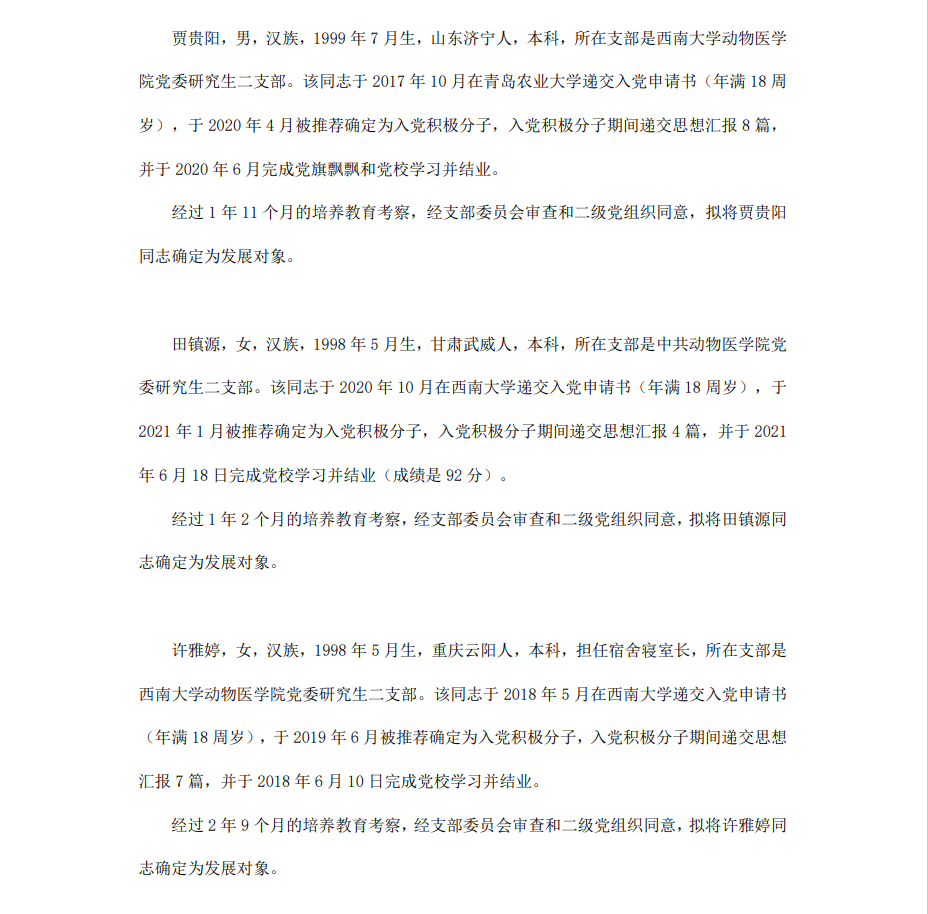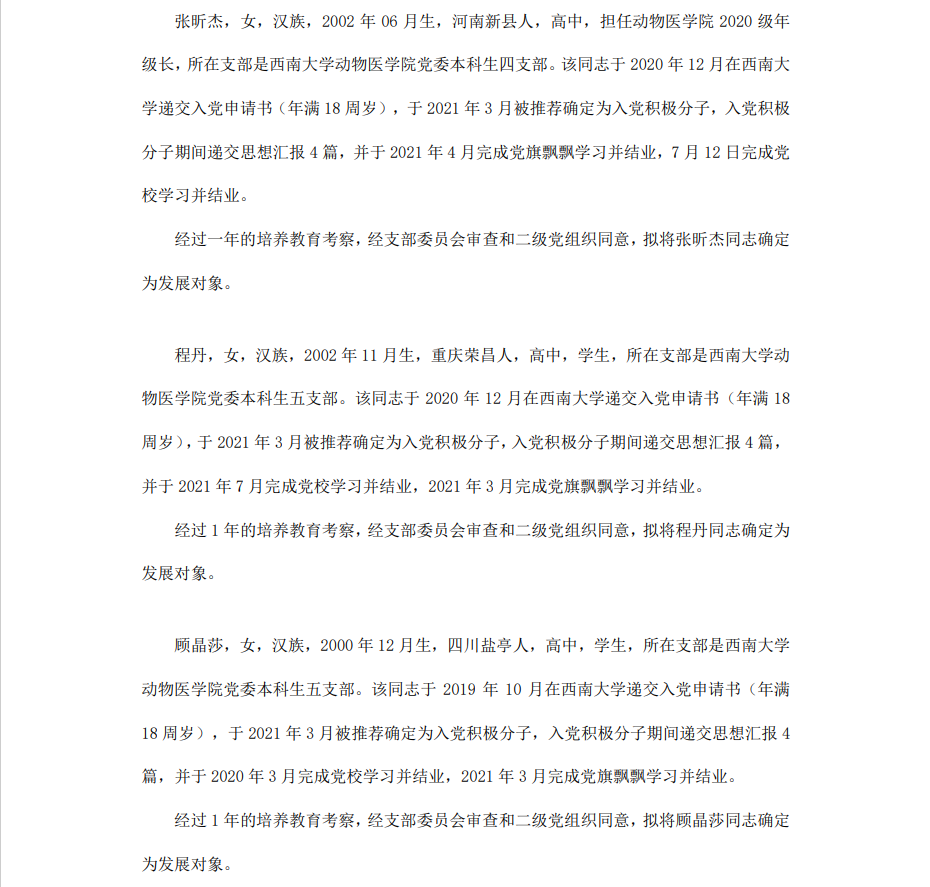 根据《中国共产党章程》、《中国共产党发展党员工作细则》和《西南大学发展党员工作实施细则》精神,经各团支部提名推荐,在征求党内外群众意见和党支部考察基础上,中共西南大学365上市公司(英国)集团委员会讨论,拟定龙潜等49名同学为近期发展对象,现将其基本情况予以公示。