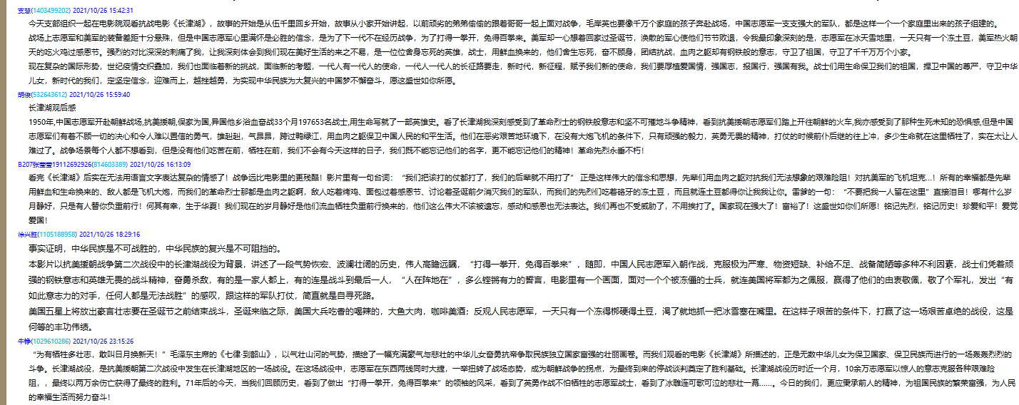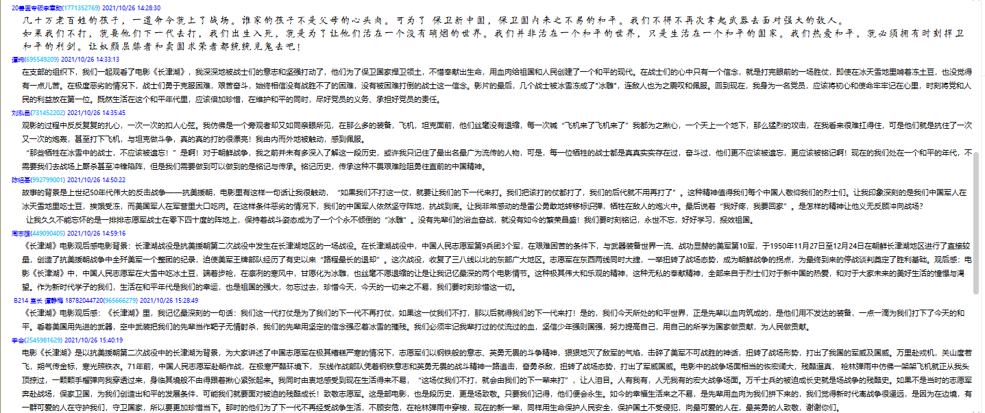 心中有信仰,脚下有力量。此次观影活动,既是一次生动形象的党史学习教育实践课,又是一次初心使命的重温之旅。党员同志们观看了《长津湖》后,无一不被影片中的战争场面所震撼,被志愿军战士的精神所感动,通过发表自己的观影心得表示对无数志愿军先烈的敬仰与钦佩之情。党员同志纷纷表示若没有无数志愿军战士的流血牺牲在前,就不会有今天的和平,作为青年大学生既不能忘记他们的名字,更不能忘记他们的精神,珍惜先烈们用生命换来的山河无恙,更要保护好、守护好这大好河山。我们身上流淌着红色的血液,更要继承革命先烈的精神,忠于祖国,不负韶华、奋发有为,将人生理想融入国家和民族的事业中,在中华民族的伟大复兴中放飞青春梦想,为实现第二个百年奋斗目标、实现中华民族伟大复兴的中国梦奉献青年人的智慧和力量!