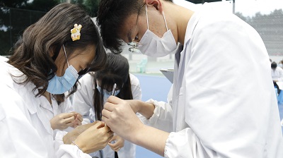 本次动医协会基础技能大赛决赛由个人赛和团体赛两部分组成,经过前期激烈的角逐,共有8位同学进入个人赛决赛,6支队伍进入团体赛决赛。其中,个人赛项目为绳结打结、器械打结以及对结的认识和器械认识;团体赛项目分为大肠缝合和犬的肌肉注射。比赛过程中,同学们各显所能,大放异彩,互相帮助,默契配合,尽展我院学子良好风貌。