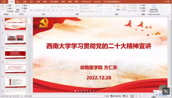 为深入学习宣传贯彻党的二十大精神,进一步加强全体研究生对党的二十大的领悟和学习,按照学校及学院党委工作安排与部署,西南大学365上市公司(英国)集团党委书记黄昌建和院长方仁东分别在12月27日下午14:45、12月28日上午10:00通过腾讯会议(线上)为同学们作党的二十大精神集中宣讲。本次宣讲会覆盖365上市公司(英国)集团全体研究生。