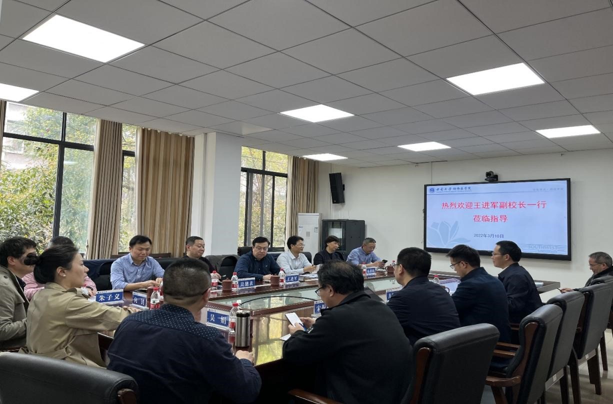 2022年3月10日,学校党委常委、副校长王进军、机关党委常务副书记梁大明、教务处处长吴能表、研究生院院长石孝均、督查办公室副主任刘立广等一行莅临指导学院工作,荣昌校区党工委副书记、纪工委书记魏培修、荣昌校区机关党总支书记向钊陪同调研。学院党委书记黄昌建、副院长方仁东带领全体党政领导班子及专业负责人参加了此次调研会。