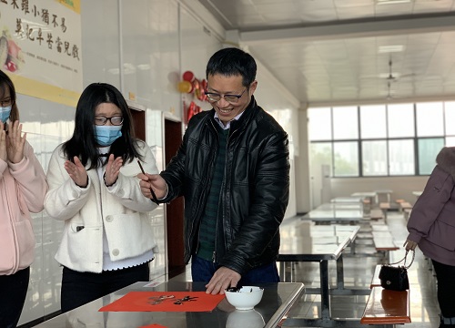 在食堂的另一角,党委书记黄昌建将提前购置的大红纸和毛笔、墨汁等文房用品摆放整齐,蘸好笔墨,凝神聚气,泼墨挥毫,一幅幅散发着清新墨香的喜庆春联呈现在眼前,一行行俊逸的书法,一句句喜庆的言语,亲笔为在场的老师和学生们送上别样的祝福。