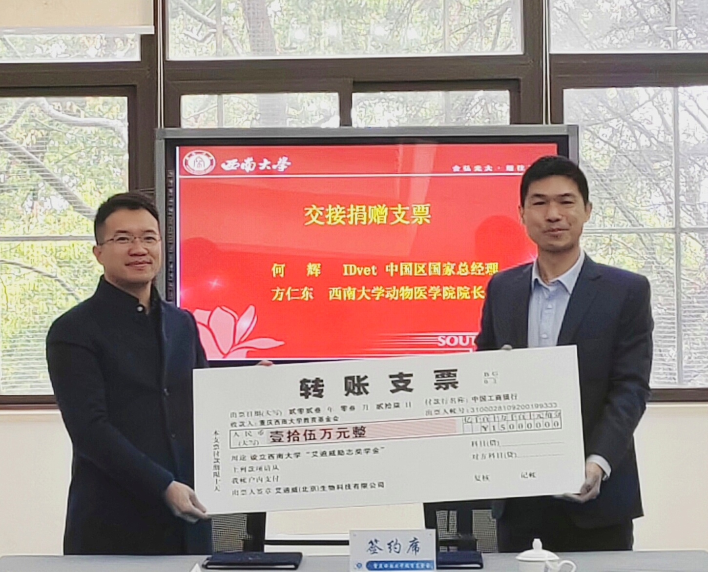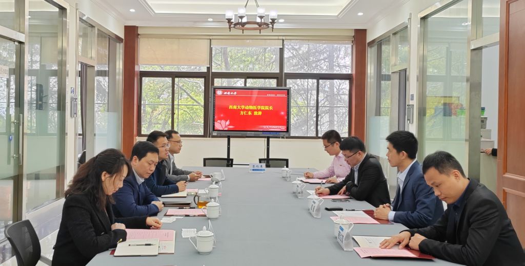 3月27日上午, IDvet中国区总经理何辉、IDvet中国区销售总监马超、IDvet中国区市场总监谢飞鸿、IDvet中国区大客户经理李文杰一行来访我校并向我院学子捐赠“艾迪威奖学金”。捐赠仪式在西南大学北区图书馆逸夫楼会议室举行,西南大学对外联络办公室主任、教育基金会秘书长唐军,对外联络办公室副主任、教育基金会副秘书长高德香,对外联络办公室副主任、教育基金会副秘书长刘涛,365上市公司(英国)集团院长方仁东和研究生辅导员李艳梅等共同出席捐赠仪式。