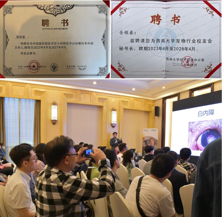 学院胥辉豪副教授主持了中国小动物医学大会开幕式以及宠物校友会成立大会。此外,胥辉豪副教授被中国畜牧兽医学会小动物医学分会聘请为中国畜牧兽医学会小动物医学分会眼科专家组负责人,通过选举被聘请为西南大学宠物行业校友会秘书长,并作为眼科专家在大会期间进行学术报告。