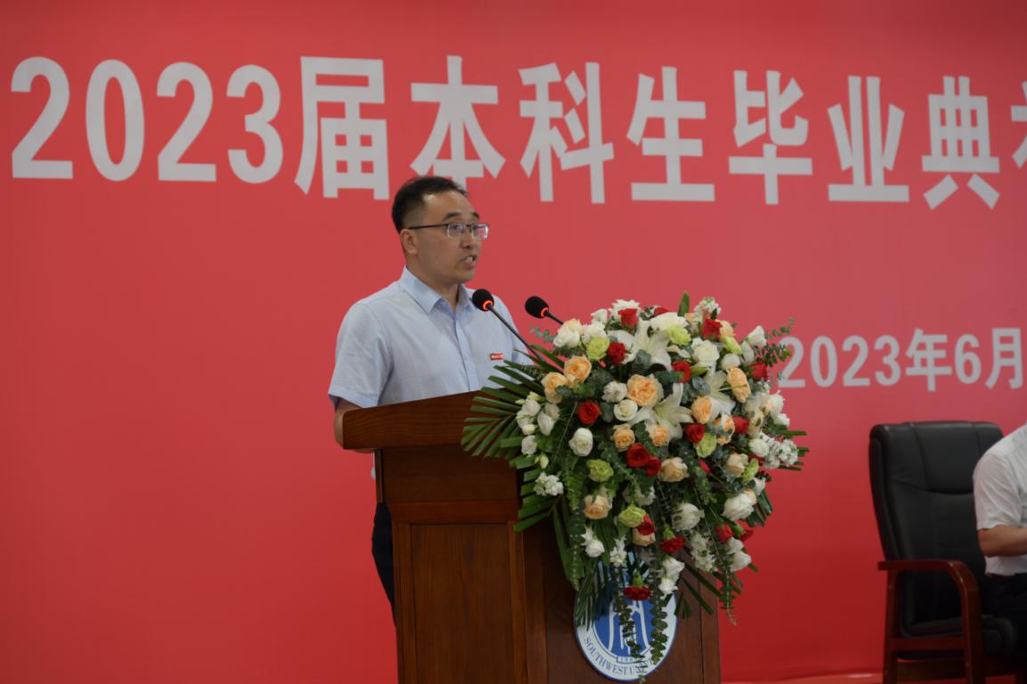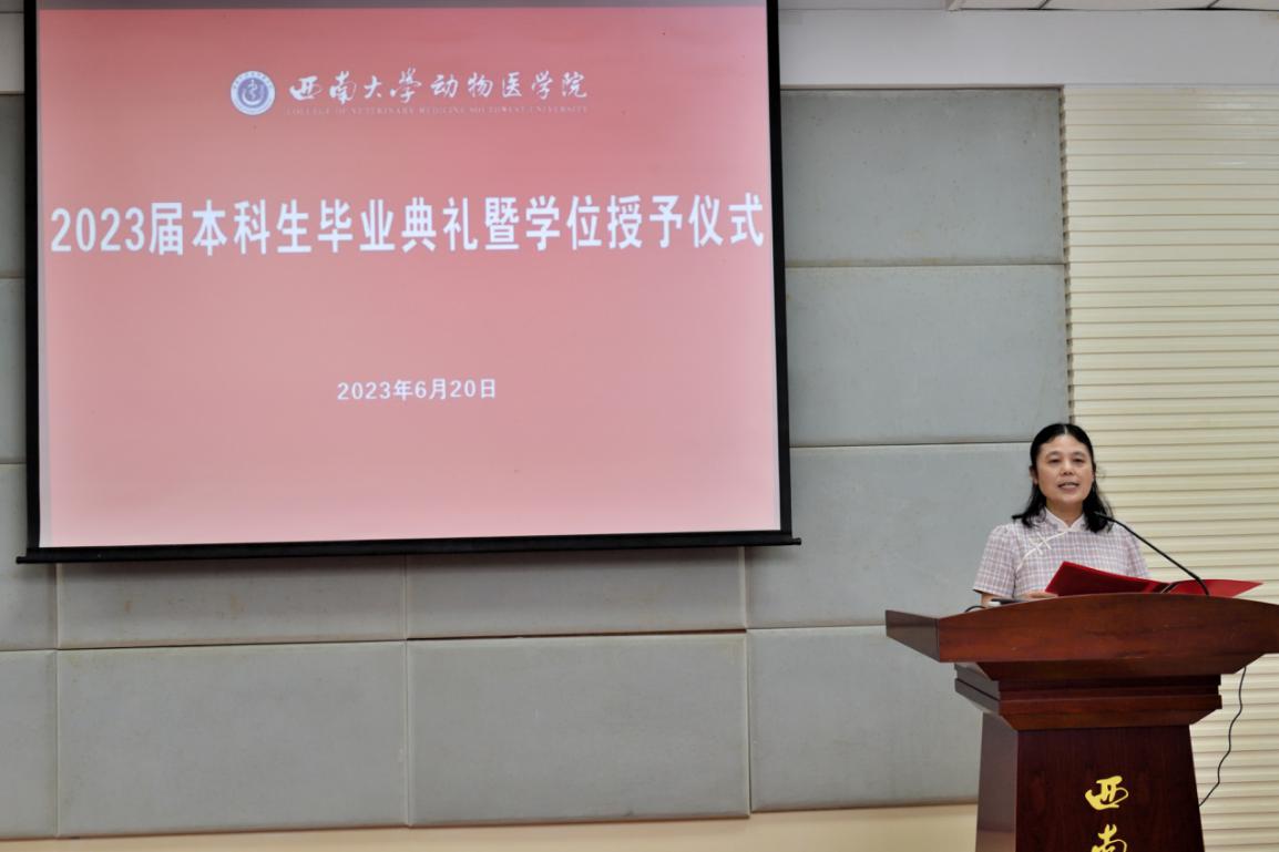 学院党委书记黄昌建宣读《西南大学关于准予2023届全日制普通本科学生毕业的决定》和《西南大学关于表彰2023年优秀大学毕业生的决定》及获表彰名单,主席台就坐领导为毕业生代表、优秀毕业生代表及优秀学位论文获得者颁发了毕业证书及荣誉证书。