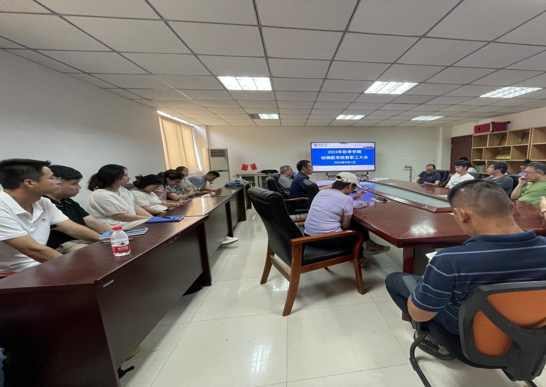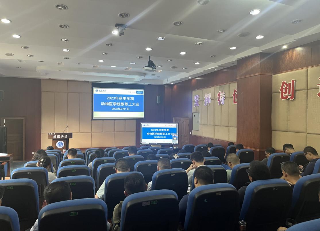 2023年9月1日下午15:30,学院召开了2023年秋季学期教职工大会,会议采用线上线下相结合的方式举行,会场分别设置在荣昌校区三教110报告厅和北碚校区动物医院210会议室。学院党政领导以及全体教职工出席会议,会议由学院党委书记黄昌建主持。