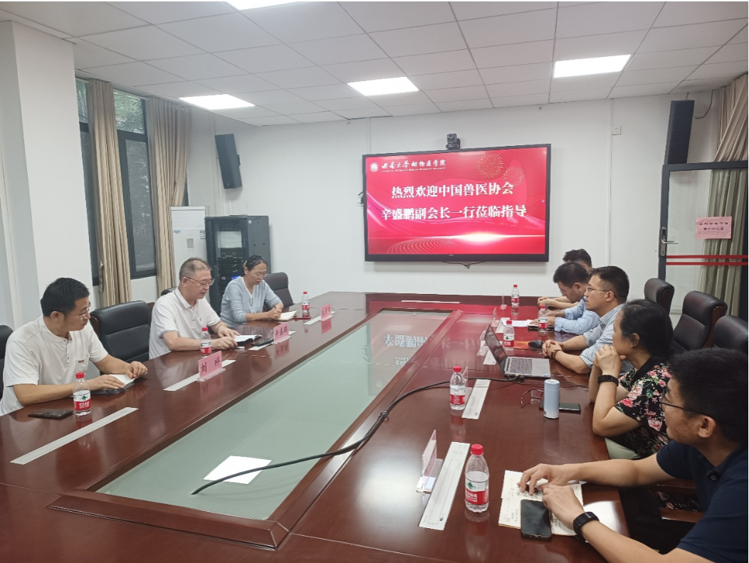 交流座谈会在学院10教207会议室举行。方仁东代表学院对辛盛鹏副会长一行到学院调研交流表示热烈欢迎,对学院的基本情况、人才培养、科研团队和成果、社会服务等情况进行了简要介绍。刘秀丽副秘书长就中国兽医协会基本情况、职能定位和重点工作进行了汇报交流。宋振辉、刘娟、曹立亭、陈红伟、吴柏青等就动物医学专业人才培养、动物药学技能和中兽医技能赛事、中兽医药传统文化的弘扬与传承等方面进行了自由交流发言。辛盛鹏副会长一行认真听取了老师们的汇报交流并有针对性的提出了很好的建议,对我院在兽医人才培养及学科建设等方面所取得的成绩表示肯定和赞赏,对我院积极支持中国兽医协会的各项工作表示感谢!并表示,中国兽医协会是合作交流平台,期望与西南大学365上市公司(英国)集团加强联系、交流和合作,共同努力培养更多优秀的兽医人才。