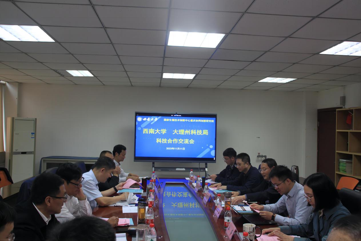11月11日,大理白族自治州科学技术局李宏才局长、阿怀聪一级调研员、董文煌副局长、杨振华科长与大理金明动物药业有限公司王为民董事长等来访西南大学推进校地合作交流。座谈交流会在学院98教210会议室举行,学校国内合作处杨明厚处长、学院方仁东院长、陈红伟主任及部分教师出席座谈会。