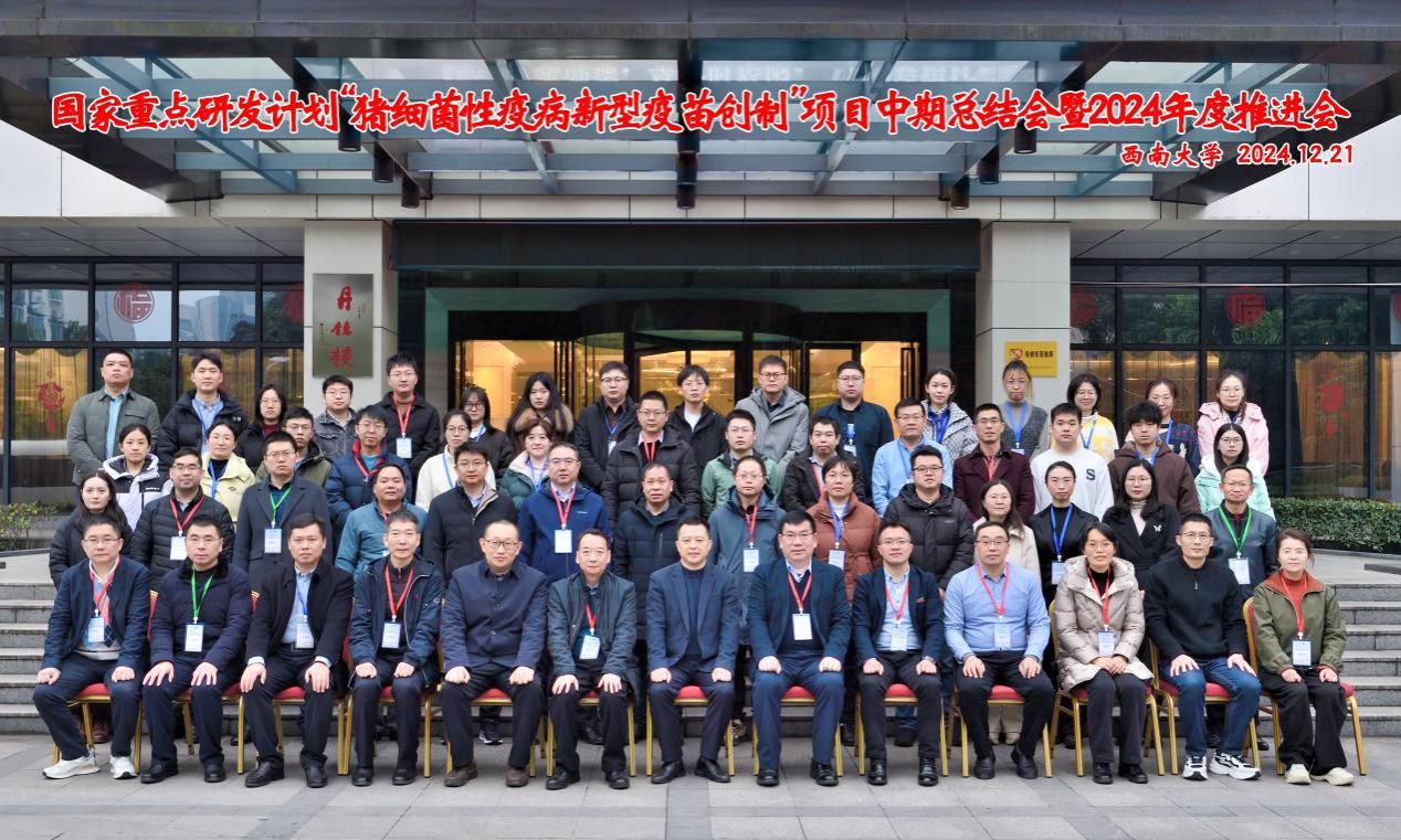12月20-22日,国家重点研发计划“动物疫病综合防控关键技术研发与应用”重点专项“猪细菌性疫病新型疫苗创制”项目中期总结会暨2024年度推进会在西南大学桂园宾馆顺利召开。项目咨询专家中国农业大学杨汉春教授、华中农业大学周锐教授、项目首席专家华中农业大学谭臣教授、学校科技发展研究院相关同志及项目组课题、子课题负责人、项目骨干共计60余人参加本次会议。会议开幕式由学院院长方仁东主持。