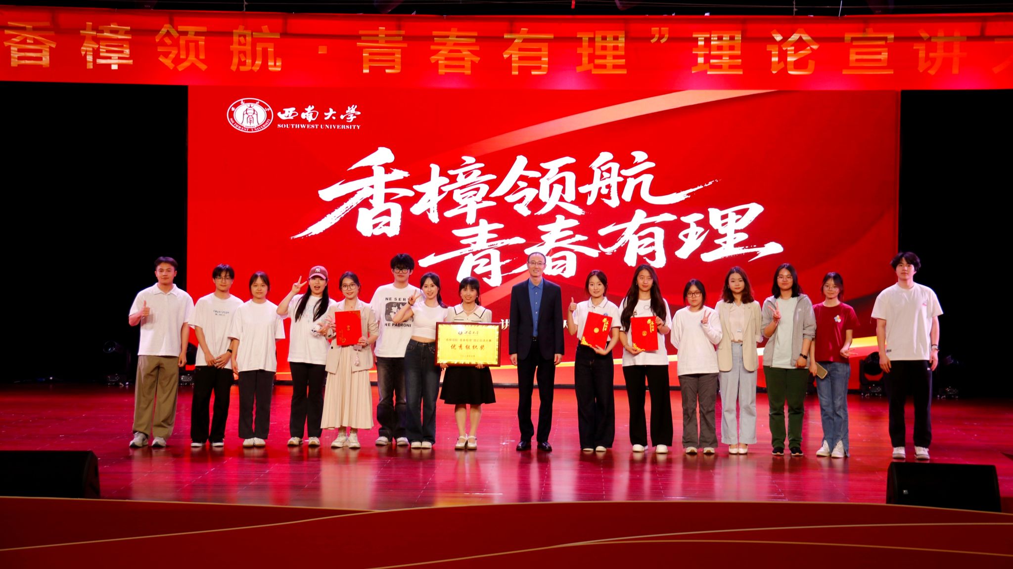 由西南大学党委宣传部、团委、社会科学处和科学技术发展研究院联合主办的“香樟领航·青春有理”理论宣讲大赛,于5月11日在北碚校区圆顶3楼报告厅顺利举办。学院高度重视本次赛事,精心组织,积极筹备,充分发挥理论宣讲引领凝聚青年的功能,积极响应赛事号召,择优选派两支优秀队伍参赛。两支参赛队伍凭借扎实深厚的理论功底、娴熟精湛的宣讲技巧和昂扬饱满的精神状态,在复赛的激烈角逐中脱颖而出,进入决赛。