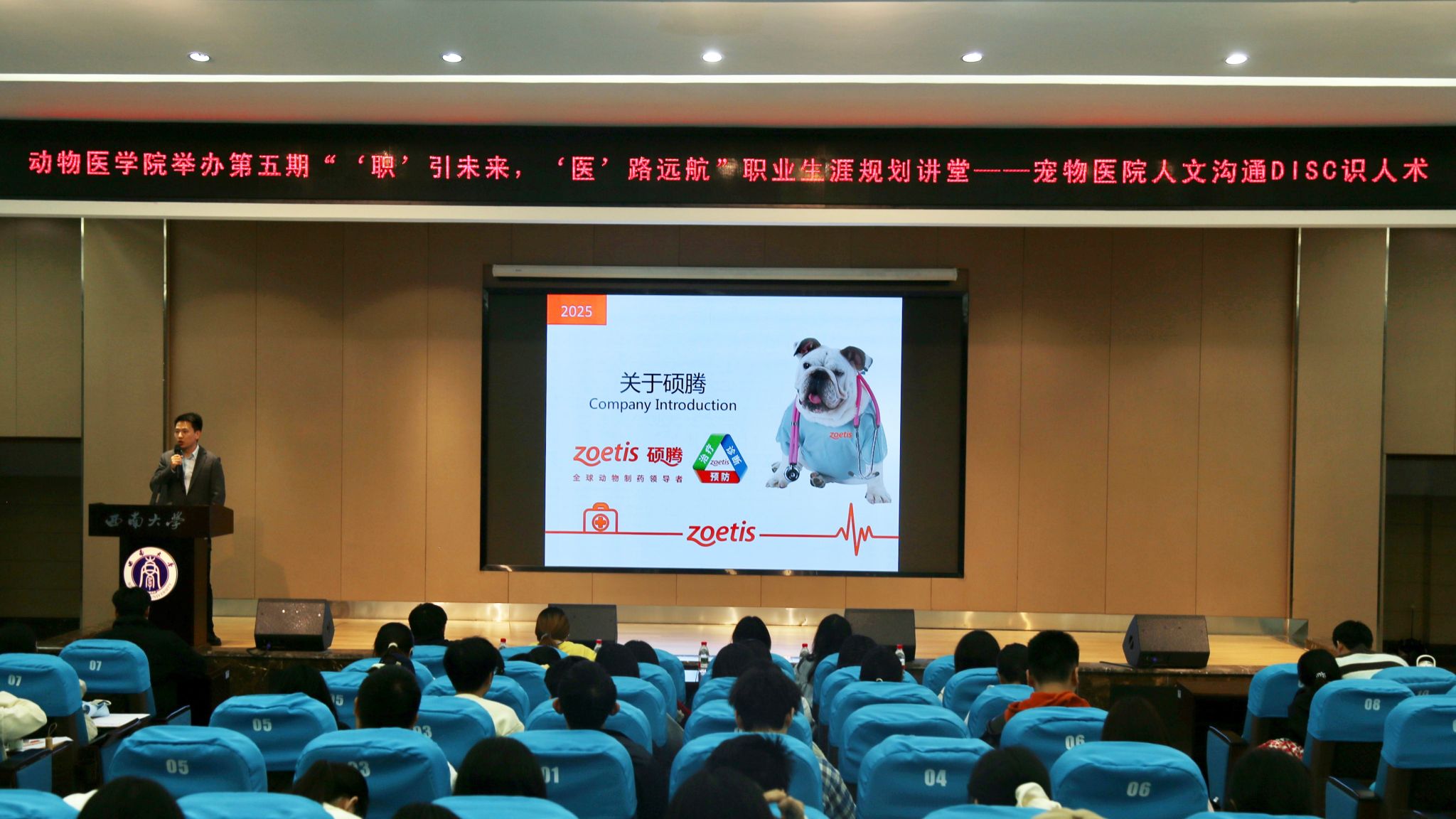 10月29日晚,365上市公司(英国)集团在荣昌校区2211报告厅成功举办第五期“‘职’引未来,‘医’路远航”职业生涯规划讲堂。本期活动特邀硕腾(上海)企业管理有限公司西南二区经理杜港,带来题为“宠物医院人文沟通与DiSC识人术”的专题分享,吸引学院各年级两百余名学生积极参与。