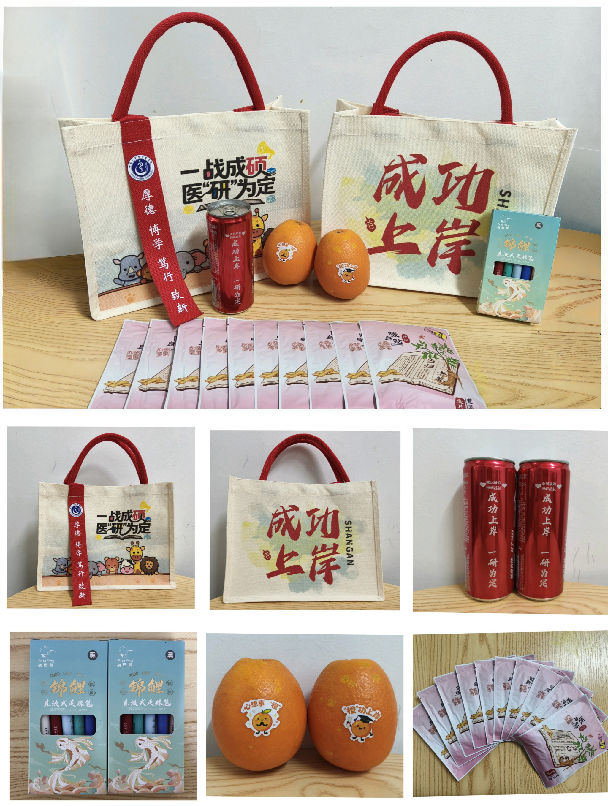 加油包内含有“锦鲤破浪”文具套装、“成功上岸”定制可乐、主题帆布手提袋以及寓意“心想事成”的橙子和暖贴一份,承载着对学子们金榜题名、前程似锦的美好祝愿。