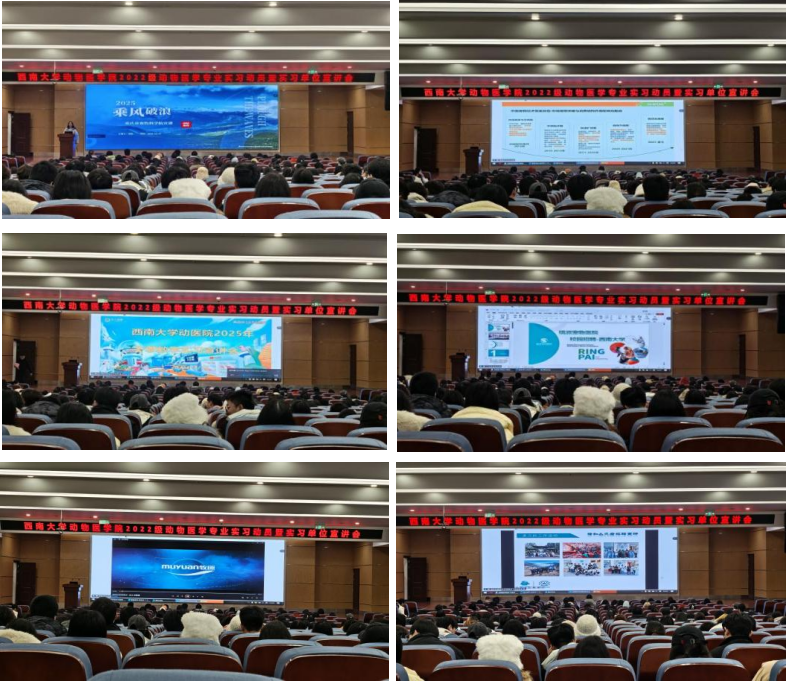 在实习单位宣讲环节,重庆市畜牧科学院、牧原食品股份有限公司、瑞派宠物医院管理股份有限公司、新瑞鹏宠物医疗集团、重庆正大农牧食品有限公司、新瑞鹏宠物医疗集团有限公司、四川天府新区谐和贝康宠物医院有限公司实习单位负责人,通过现场或腾讯会议形式详细介绍了企业发展概况、实习岗位设置、实践培养方案及人才招聘意向。学院通过本次大会全面明确了实习流程、考核标准与安全规范,既为学生搭建了优质实践平台,也为实习工作的有序开展筑牢基础,助力学生在实践中提升专业能力与职业素养,平稳迈向职场。