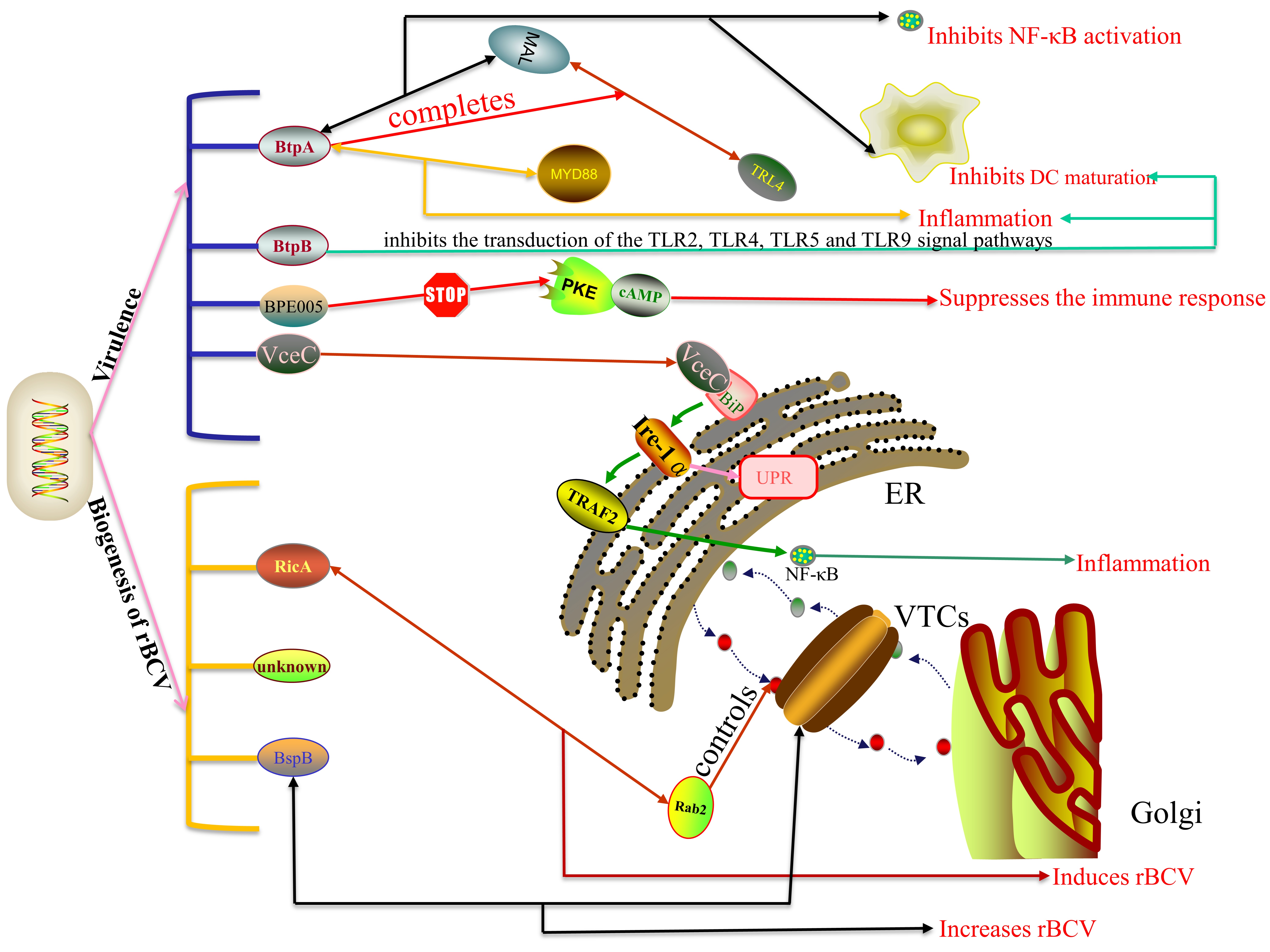 VirB系统的表达在rBCV生物发生期间达到峰值,在细菌开始复制时,其表达量逐渐减少,表明VirB系统的表达受到宿主细胞严格的调控。我们将VirB系统的调节因子分为直接调节因子(HutC、IFH、群体感应调节蛋白BlxR和自体诱导剂)和间接调节因子(葡萄糖焦磷酸化酶和Hfq)。