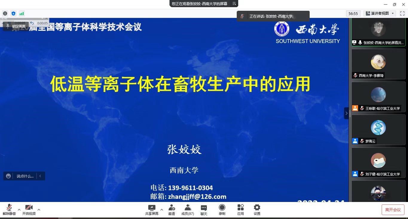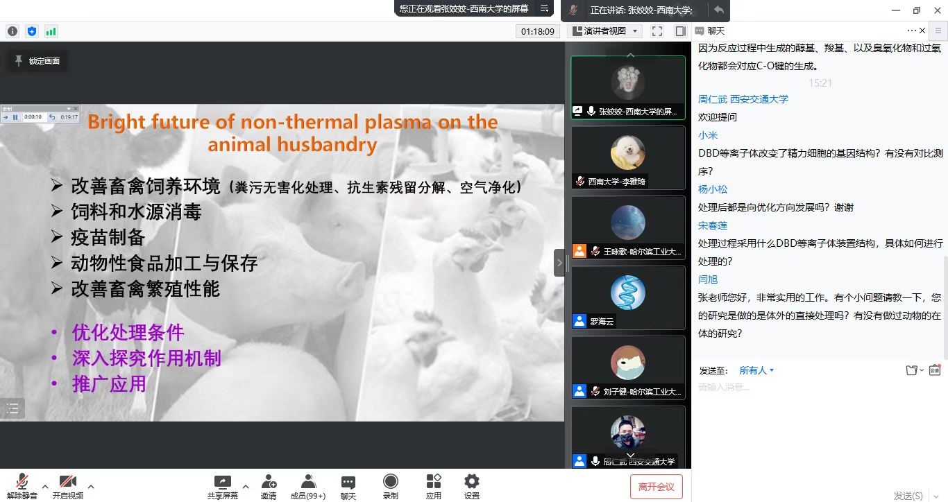 我院张姣姣副教授受邀参加了本次大会,在“等离子体技术在生命科学方面的应用”专题分会场做了以“低温等离子体在畜牧生产中的应用”为题的邀请报告。张姣姣副教授从当前制约我国畜牧业健康发展所面临的环境污染和药物滥用等问题入手,介绍了低温等离子体技术在动物饲养环境净化、饲料水源消毒、动物疫苗制备、动物食品加工与保存等方面的应用情况,并结合课题研究内容,就低温等离子体提高畜禽精液品质和睾丸支持细胞增殖能力的条件优化、机制研究和临床应用等内容做了详细介绍,最后指出当前低温等离子体技术在畜牧生产中的推广应用还需要解决的几个关键问题。在报告结束后,参会老师们和同学们对低温等离子体在畜牧生产应用颇有兴趣,纷纷进行提问和交流,张姣姣副教授一一做了回答。