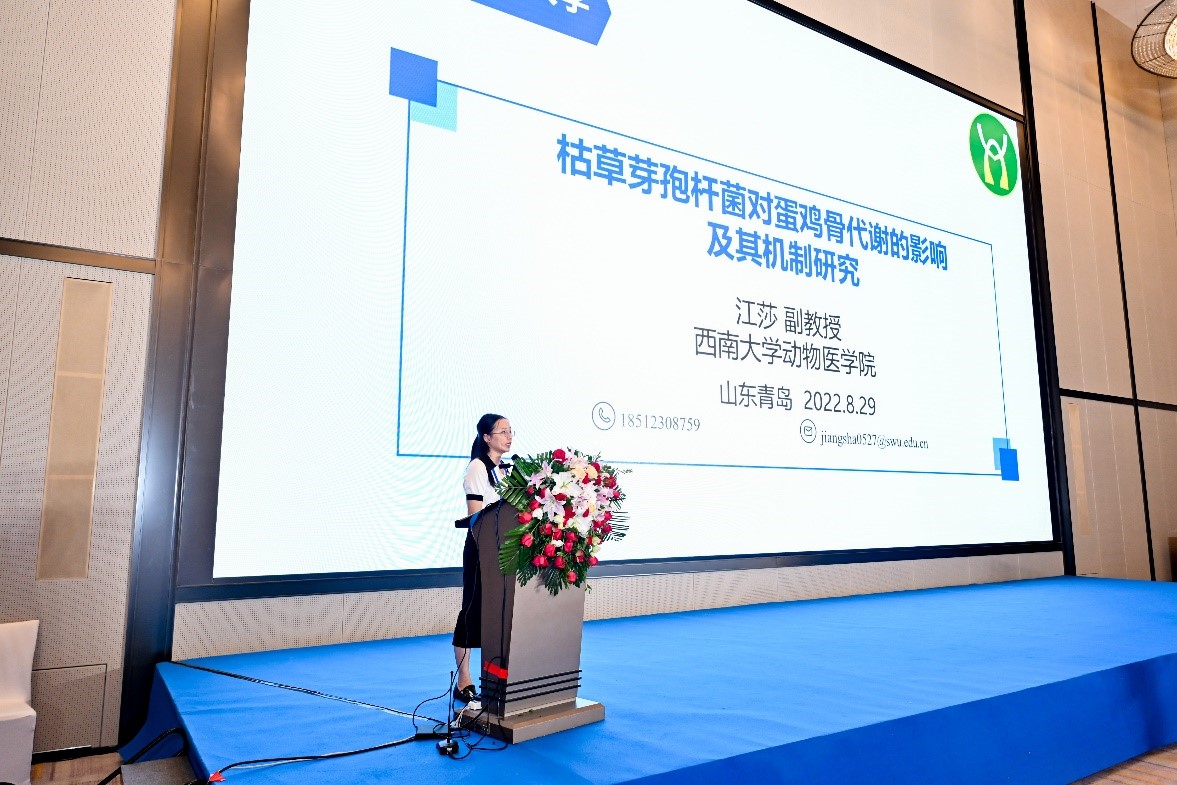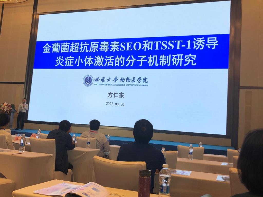 彭练慈、叶超、方仁东等提交了会议交流论文4篇,其中“金葡菌超抗原毒素SEO和TSST-1诱导炎症小体激活的分子机制研究”被兽医公共卫生学分会遴选为大会的优秀论文;“重庆地区猪场金黄色葡萄球菌和沙门菌流行病学调查及其携带整合子情况分析”被兽医食品卫生学分会遴选为壁报交流。邹昕羽、江莎等作者提交的会议论文“枯草芽孢杆菌对蛋鸡骨代谢的影响及其机制研究” 被动物福利与健康养殖分会遴选为大会的优秀论文。方仁东教授和江莎副教授分别在人兽共患病专题论坛和动物福利与健康养殖专题论坛上围绕以上两篇优秀论文的内容做大会报告。方仁东教授围绕金葡菌超抗原毒素诱导宿主天然免疫应答,阐述了超抗原毒素激活炎症小体的分子机制;江莎副教授介绍了枯草芽孢杆菌对蛋鸡生产性能和血液学指标的影响,着重介绍了枯草芽孢杆菌对蛋鸡骨骼生理的影响及其机制。