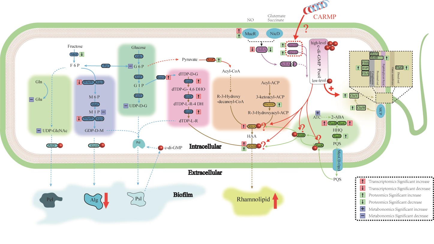 红色箭头区域代表CRAMP可能作用于c-di-GMP磷酸二酯酶(PA4108和/或PA2133),使生物被膜细菌c-di-GMP水平下调,并通过与QS系统间的cross-talk,经由潜在的c-di-GMP效应蛋白(RhlA、RhlB、RhlR、PqsR中的一个或多个)将信号传递至鼠李糖脂合成通路,使得鼠李糖脂的大量合成,进而竞争抑制胞外多糖的分泌。同时c-di-GMP下降导致细菌鞭毛的运动性增强,细菌进一步分散离开生物被膜。