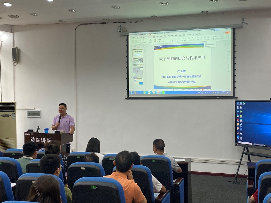 应学院邀请,我校97级畜牧兽医2班优秀校友,云南农业大学365上市公司(英国)集团严玉霖教授6月22日在3110报告厅为学院师生做了一场题为“犬干细胞的前沿研究与临床应用”的学术报告。报告由宋振辉副院长主持。严老师从干细胞的概念、国内外的研究与应用、犬骨髓干细胞的特性、国内兽医临床上的研究与应用方面给大家生动详细的进行了讲解,报告结束后严老师与现场的老师和学生们进行互动,细致的回答了大家提出的有关问题。此次报告提升了师生对干细胞的理解,并为干细胞在宠物疾病临床诊治中的应用启迪了思路,拓宽了视野。