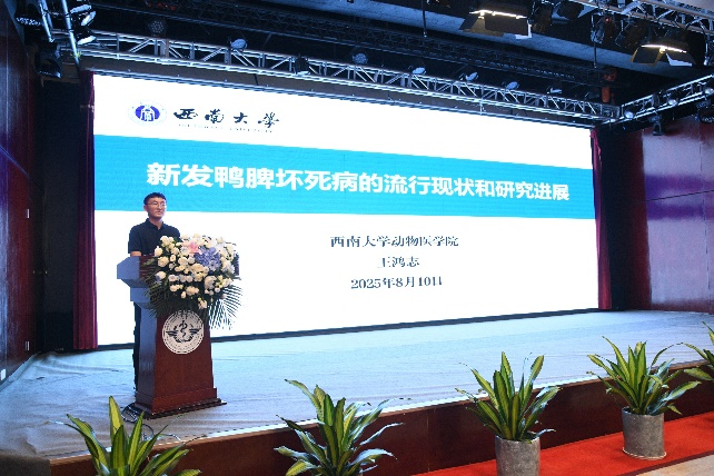 本次大会以“科技领航,数智赋能,守护公共卫生安全屏障”为主题,围绕人兽共患病、动物疫病防控、食品安全、公共卫生、生物安全等学科方向的新理论、新方法、新技术、新成果进行了专题报告与讨论。应大会邀请,王鸿志以“新发鸭脾脏坏死病的流行现状与研究进展”为题进行学术报告,系统汇报了病原流行特征,以及在脾脏损伤机理及天然免疫逃逸方面的最新研究成果,获得与会专家的广泛关注与积极反馈。