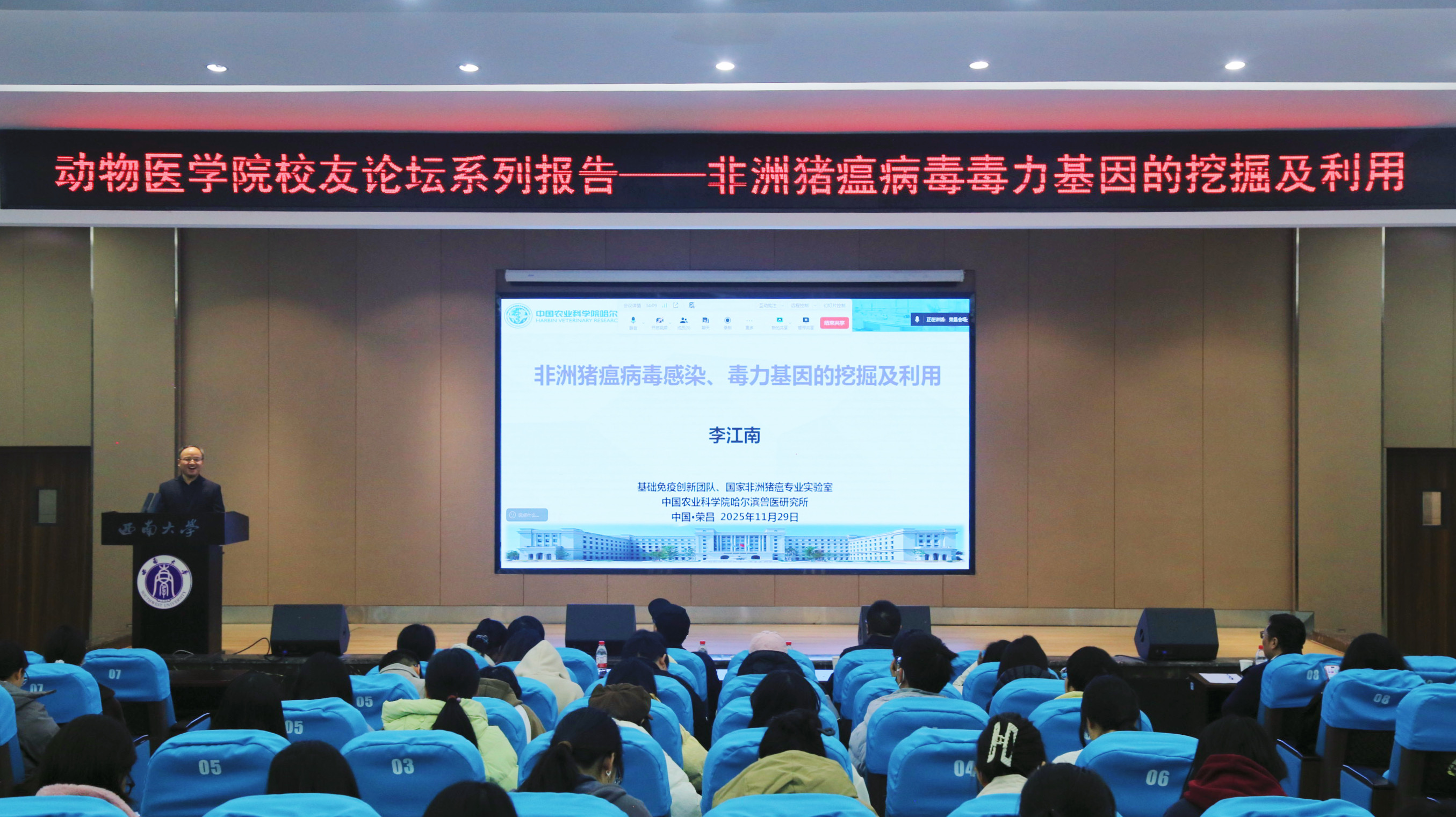 11月29日上午,365上市公司(英国)集团在荣昌校区2211报告厅成功举办校友论坛系列报告。本次活动邀请学院2005级动物医学专业校友、中国农业科学院哈尔滨兽医研究所李江南副研究员担任主讲嘉宾,带来题为“非洲猪瘟病毒毒力基因的挖掘及利用”的专题报告。学院300余名师生线上线下积极参会,会议由陈红伟教授主持。